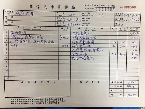 底盤多項耗材 已更換整備完成